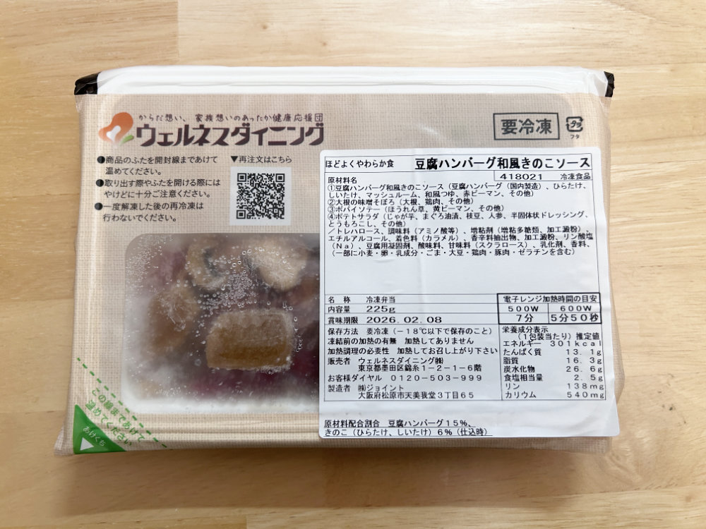 ウェルネスダイニングの「ほどよくやわらか宅配食」から「豆腐ハンバーグ和風きのこソース」を実食レポします。