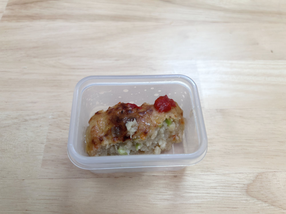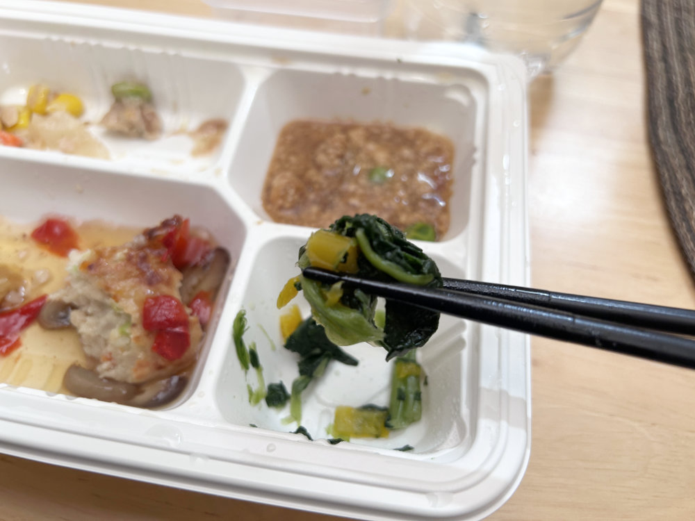 葉物類も入っていますが、しっとりとした仕上げで、短かめに切ってあります。飲み込みやすさに配慮されていますね。好印象です。