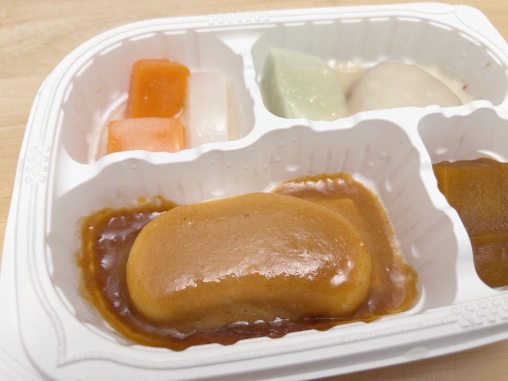 そして驚きだったのが写真奥に写っている「人参サラダ」と「玉ねぎゼリー」です。なんとこの2点はほんのり冷たいんですよ! 最初「温め時間を間違えたかな?」と思ったのですが、そんなことないはず。他の食材は全部温かいです。