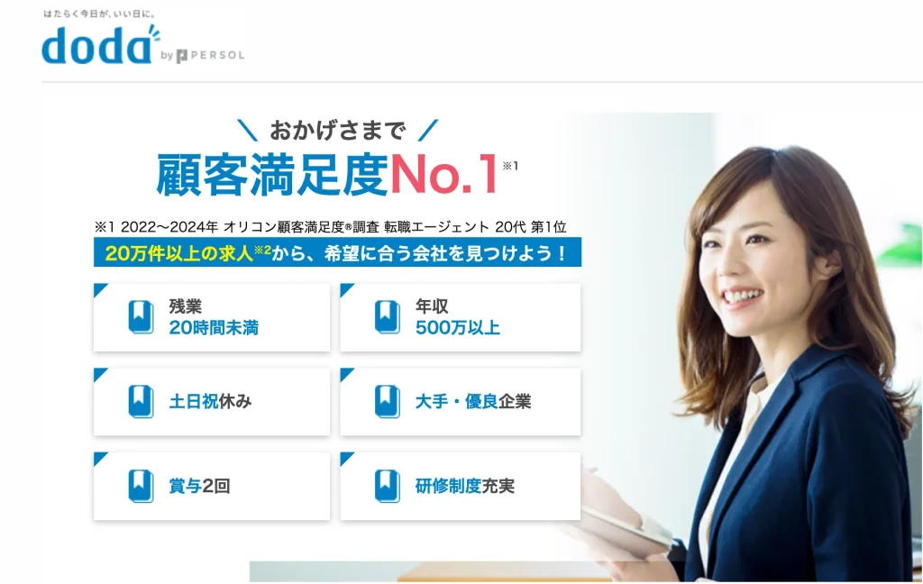 「doda(デューダ)」の特徴は上記の通り。最大規模の転職サイトなので、一般企業への転職を検討している人は登録してよいでしょう。
